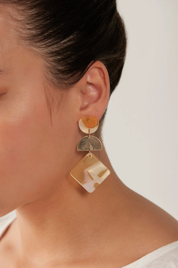 Featuring acrylic and metal forms for a unique layered look, these drop earrings add a soft colourful accent to your accessories collection.