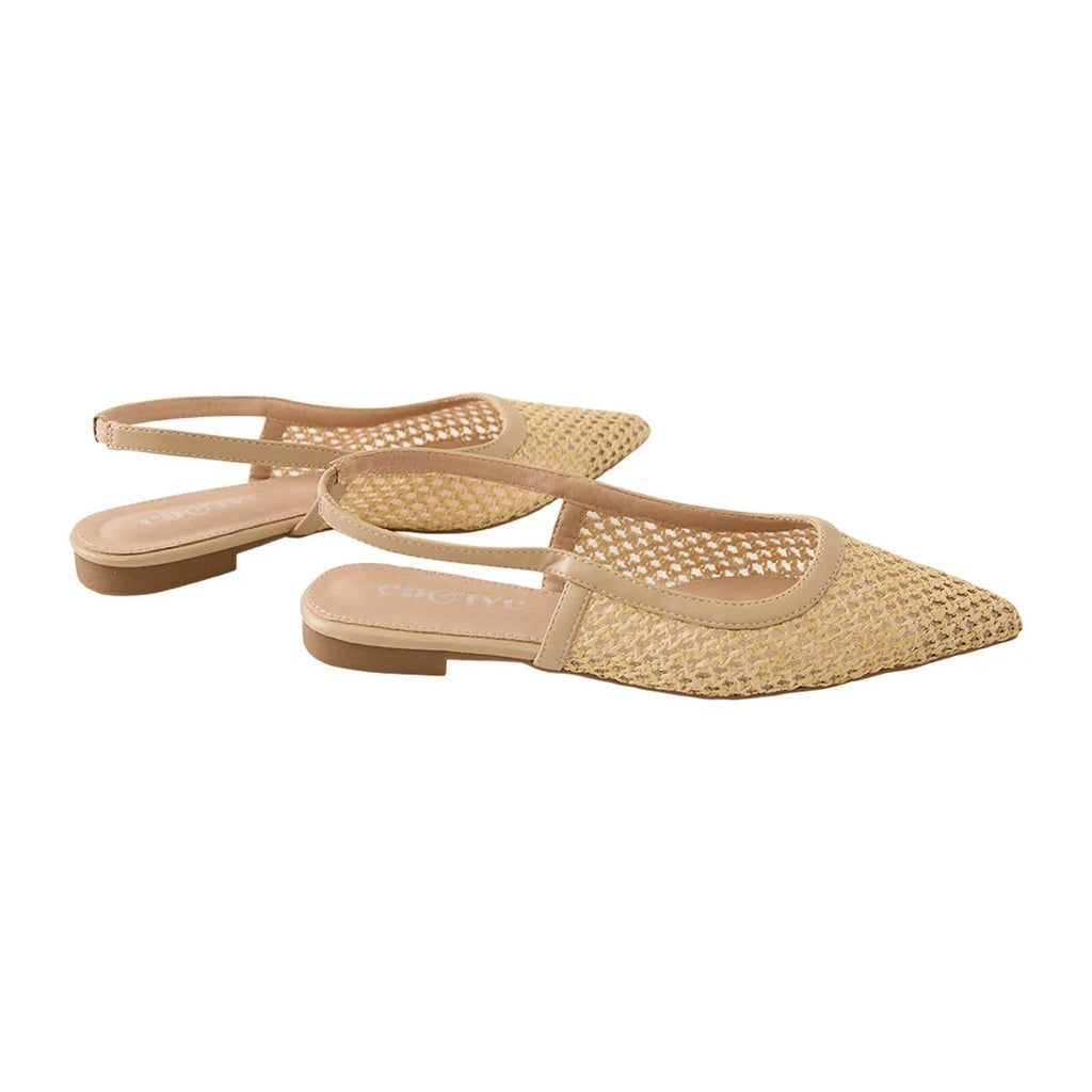 A relaxed summer flat with artisan detail. Features a rattan-look upper with a slingback design and cushioned sole for all-day wear.