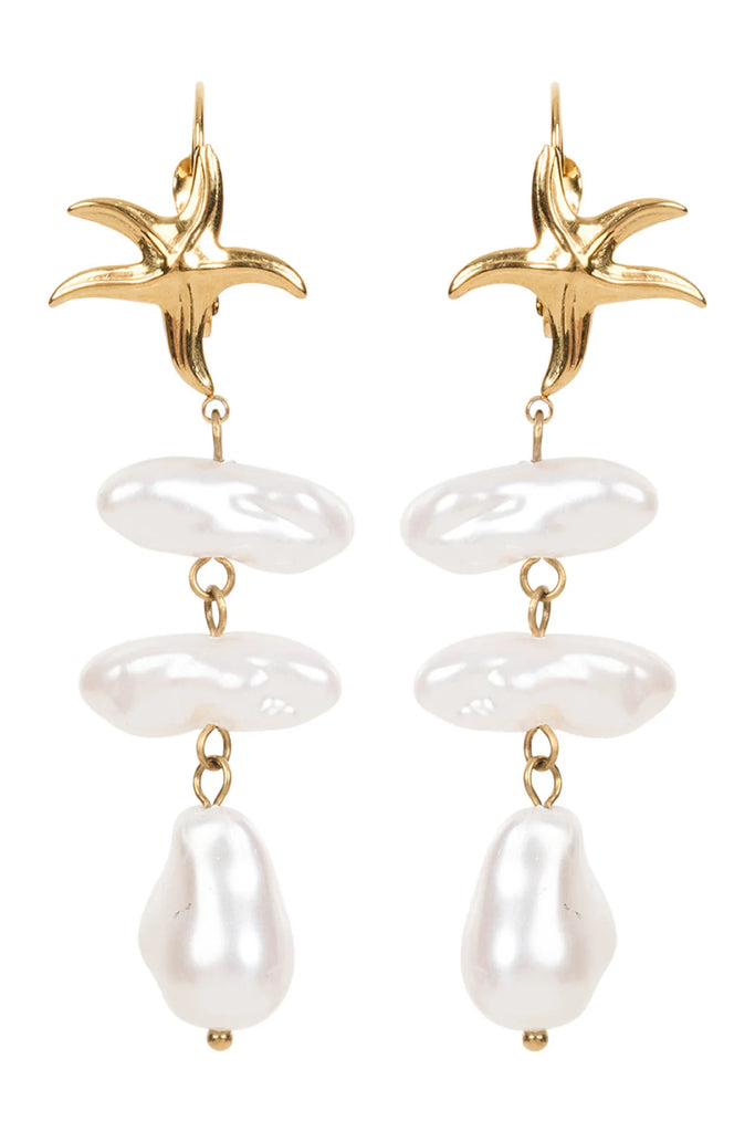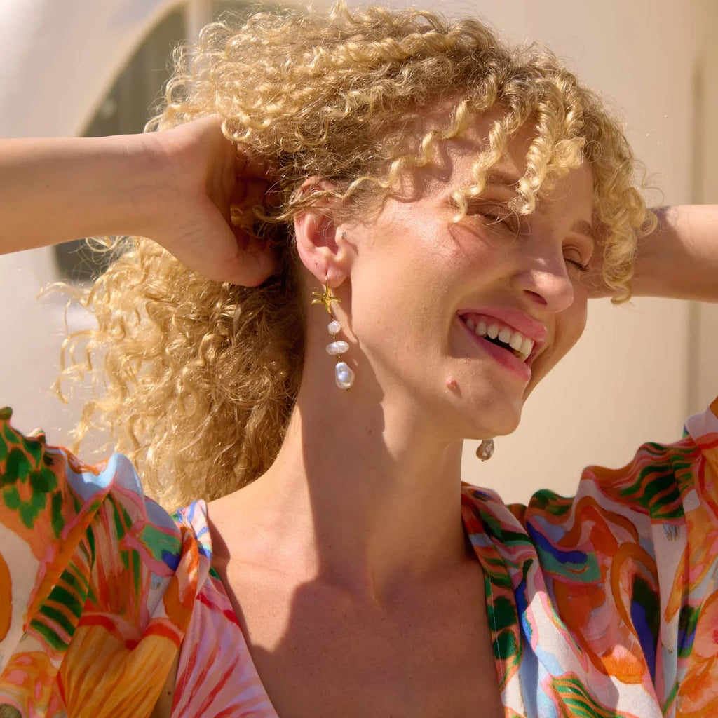 Delicate and dreamy, the Bahama Pearl Earring Drop features a dainty chain suspended from a small gold-look starfish stud, adorned with three organically shaped imitation pearls for movement and shimmer.