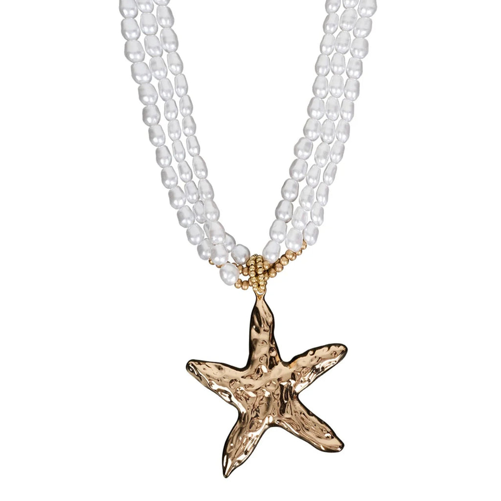 The showstopper. The Bahama Sea Necklace features triple strands of imitation pearls, anchored by a bold gold-look starfish pendant. Layered, luxe, and totally holiday-ready.