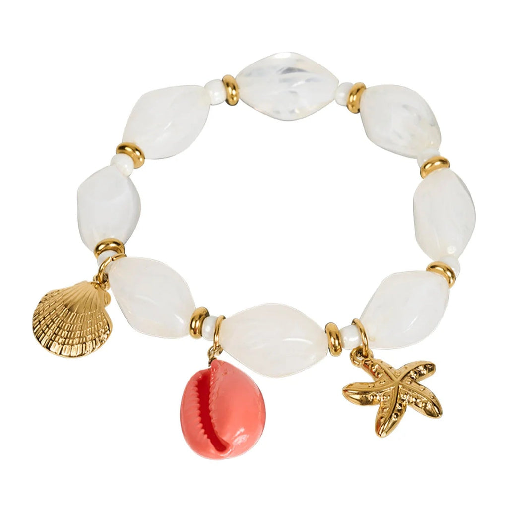 All the fun of the Cabana Necklace, in bracelet form. Chunky pearl-like beads and mini gold accents are paired with hanging sea treasures - shells, cowries and starfish. A little piece of paradise for your wrist.