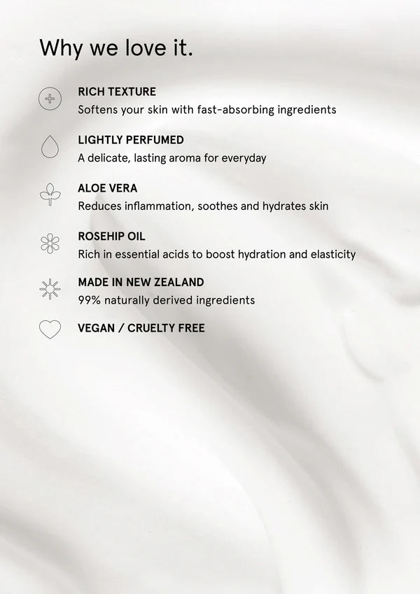 Infused with Rosehip Oil. One of Mother Nature’s treasures, Rose hip oil helps to nourish, rejuvenate and hydrate the skin.