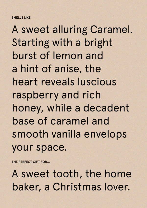 Indulge in the sweet allure of Caramel Vanilla. Starting with a bright burst of lemon and a hint of anise, the heart reveals luscious raspberry and rich honey, while a decadent base of creamy caramel and smooth vanilla envelops your space.