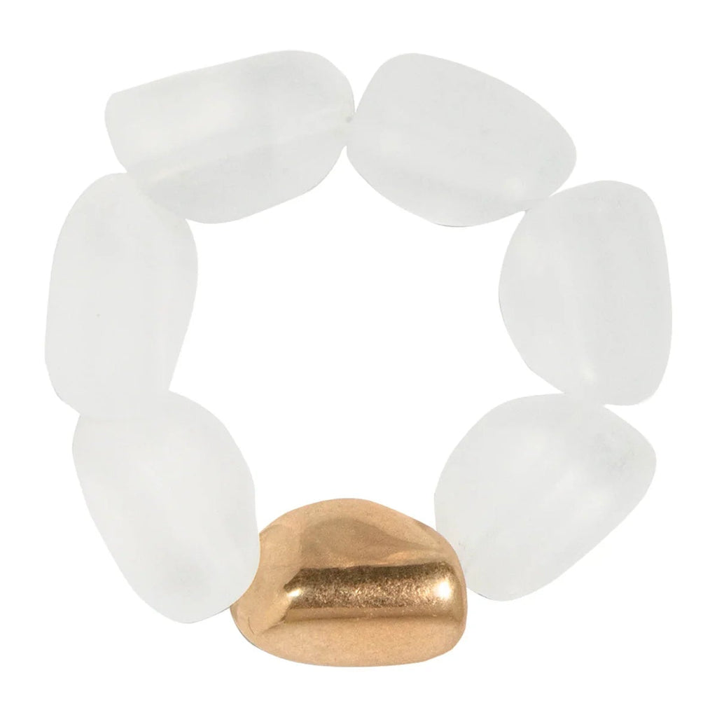 An elasticated bracelet made from frosted resin beads. Sculptural and understated.