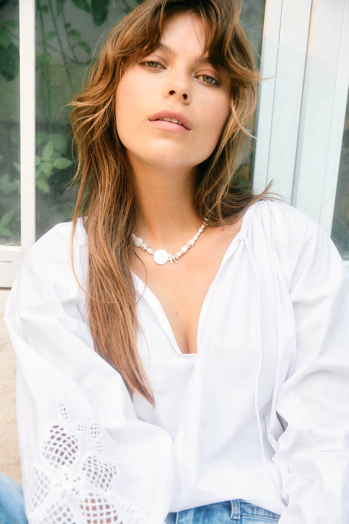This silver-tone necklace brings together freshwater pearls and organic-style beads, anchored by a pressed silver coin pendant. Quietly confident, it's a lovely choice for beachside dinners or slow mornings in the sun.