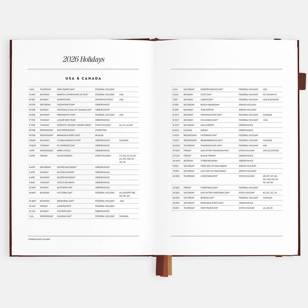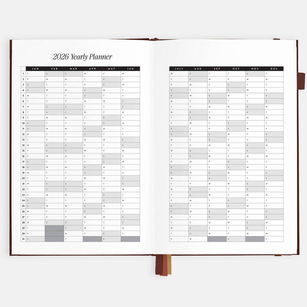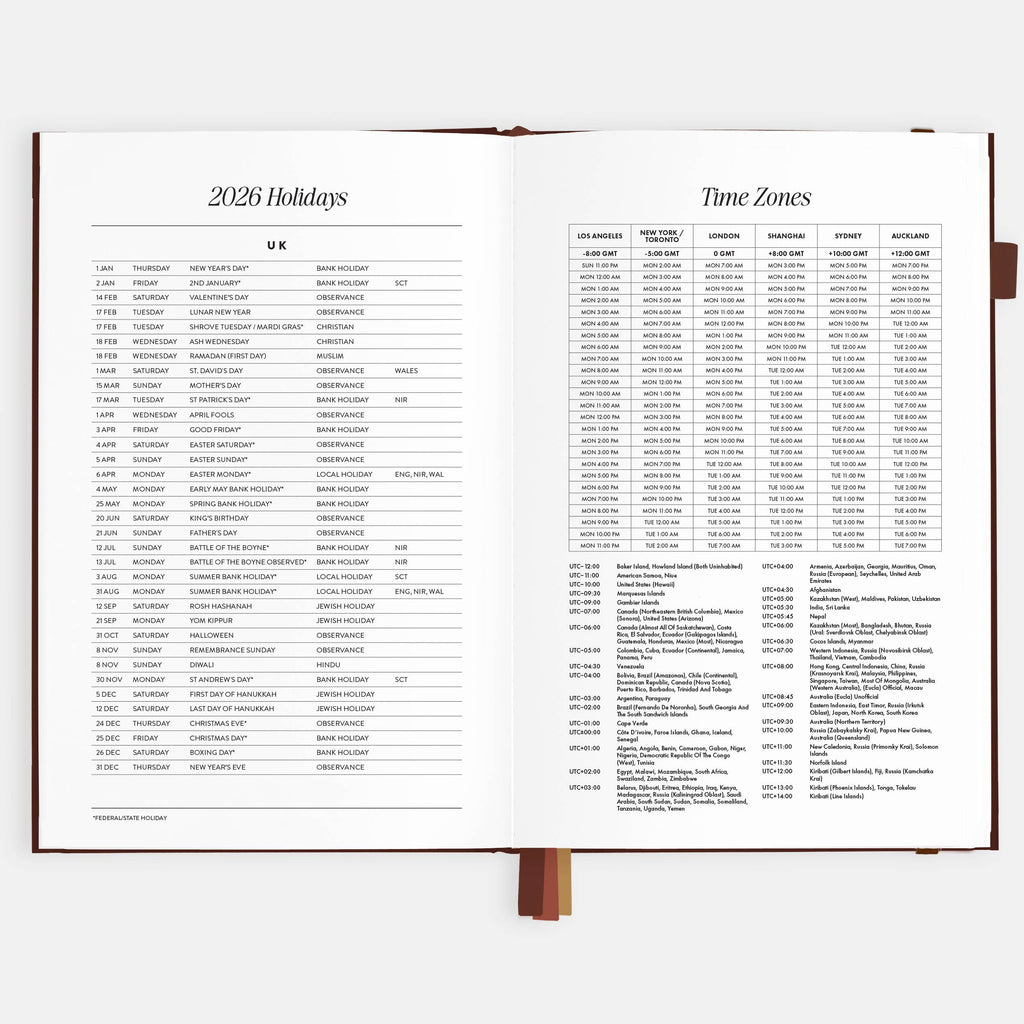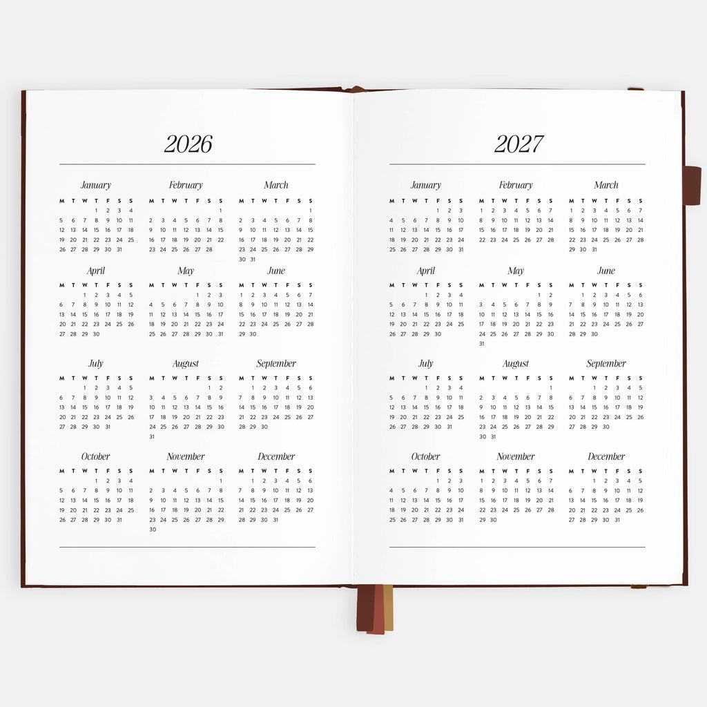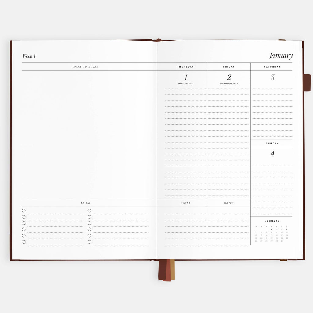 Our best-selling A5 planners are back with a brand new vertical layout and a new planning system designed to simplify your life. At Fox & Fallow we're all about making planning simple. Your planner should de-stress and simplify your life, not make it more rigid or complicated. That's why we've designed a planning system split into two halves - for your left and right brain. Featuring a vertical weekly layout, lay-flat binding, elastic closure and pen loop, document pocket at the back, three ribbons, gold foil edges, added blank pages. One week per spead and monthly spreads at the beginning of each section. Premium 120gsm paper. 208 pages.
