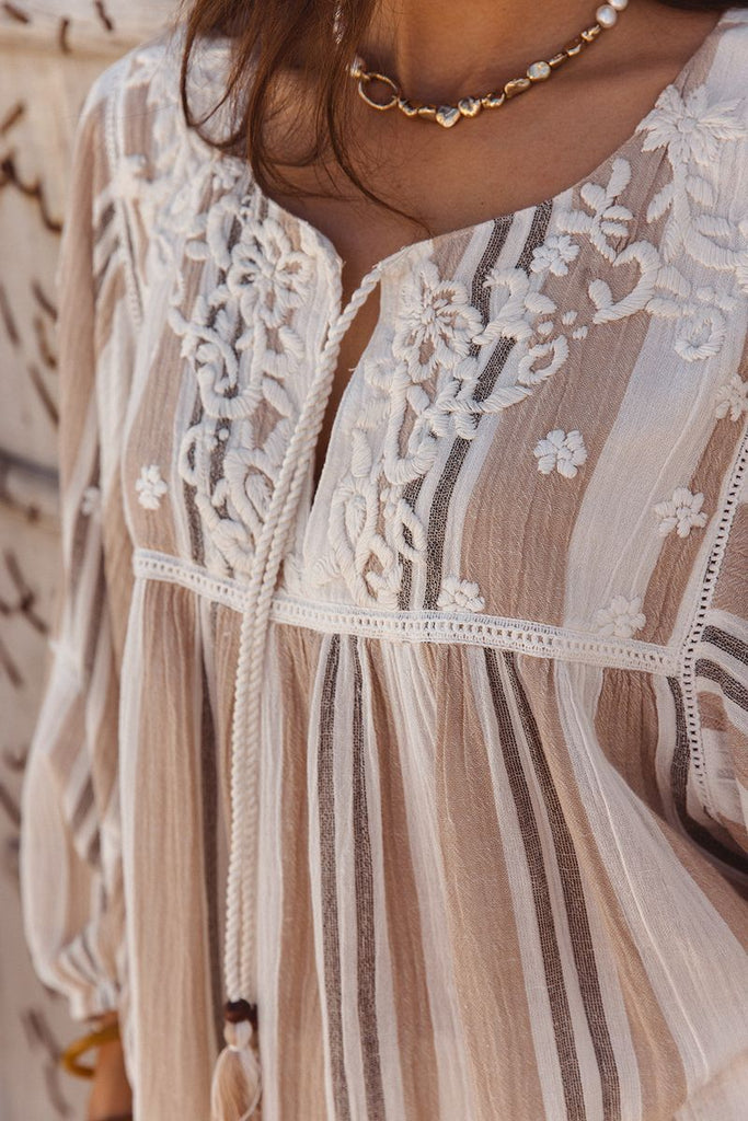 Float into spring with the Byron Top, a chic bohemian blouse designed for effortless elegance. Made from soft woven cotton, this piece features billowing sleeves and delicate embroidery details that bring a touch of artistry to your everyday wardrobe. The relaxed silhouette makes it easy to wear, while the tassel ties at the neckline add just the right amount of charm.