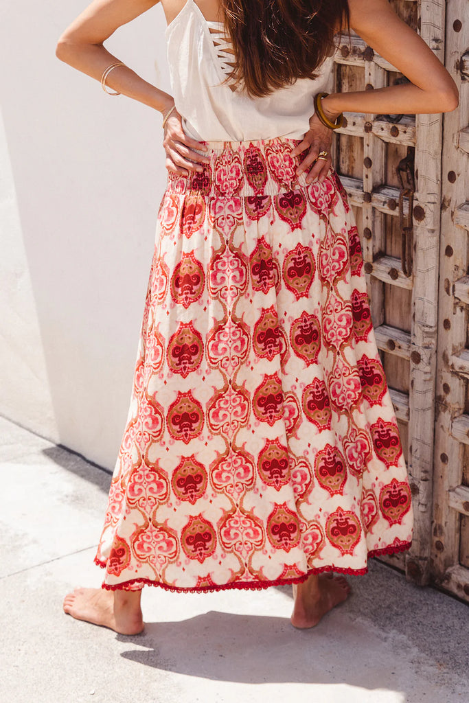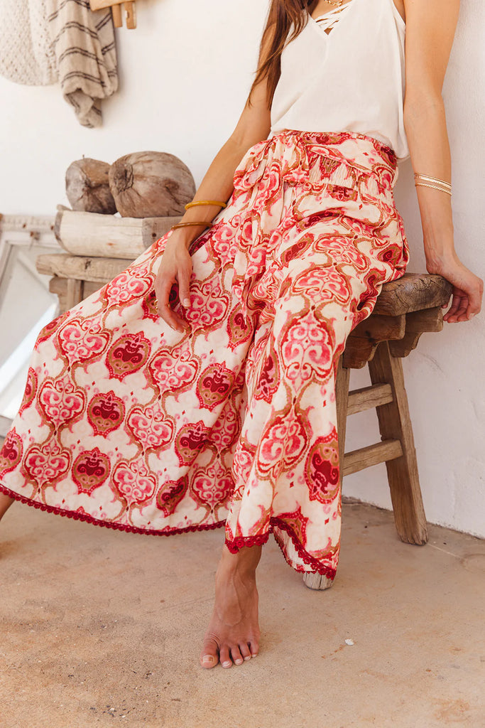 Crafted from soft, breathable viscose, they offer a luxurious drape that flows beautifully with every movement. The smocked waistband with tie detail provides comfort and adjustability, while the wide-leg silhouette adds both ease and statement appeal. The intricate Khalifa print, in hues of crimson and gold, captures the artistry of Moroccan design, making each pair a standout.