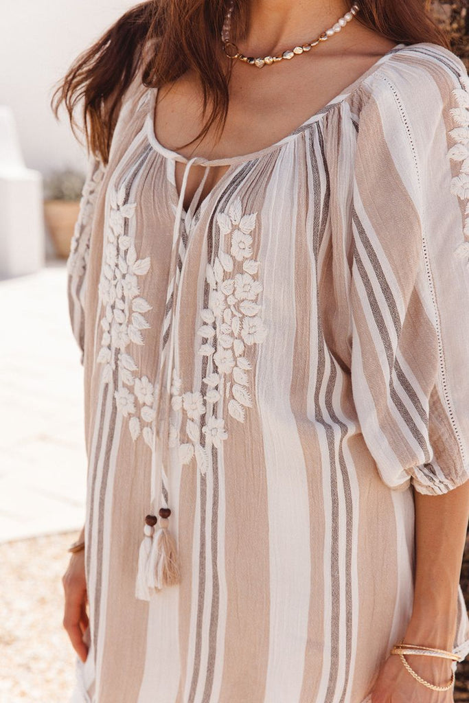 The Sydney Top is the epitome of relaxed elegance - an airy silhouette that feels as good as it looks. Crafted from breathable woven cotton in the timeless Imperial Stripe, it features soft blouson sleeves, delicate embroidery, and a tie-front neckline finished with tassel accents.