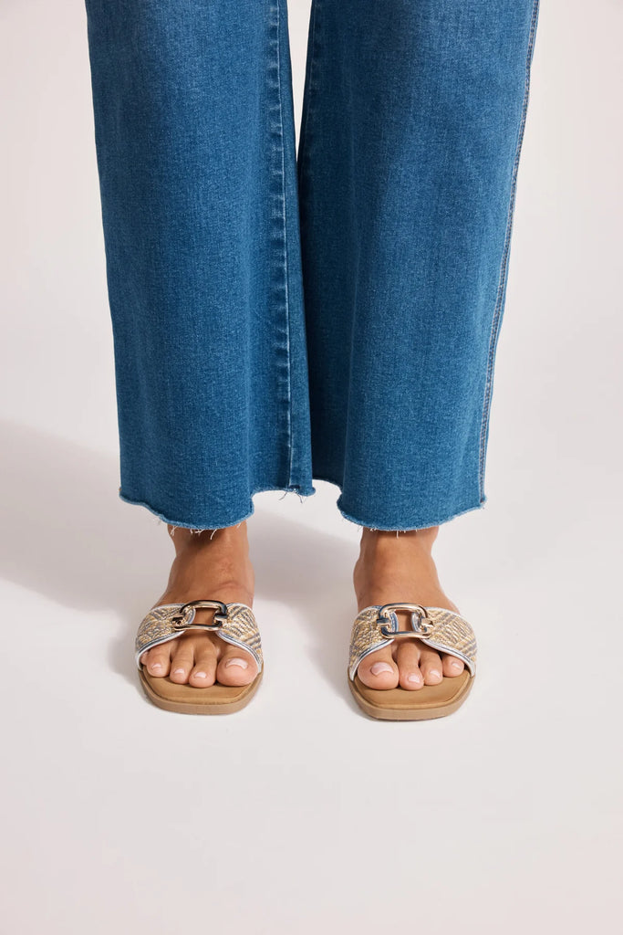 A modern update on the everyday slide. Made from vegan leather with a designer-style metal hardware clasp. Features a cushioned sole for comfort.